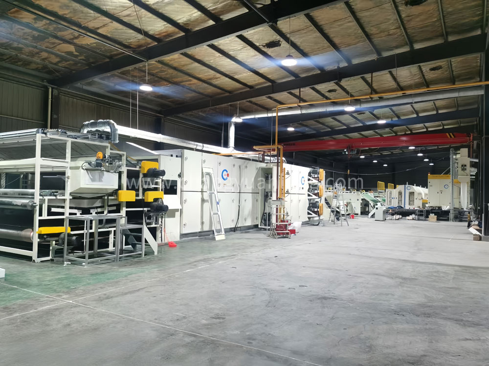 一、喷胶棉设备工艺流程:开包-开松机-振动给棉机-梳理机-铺网机-烘箱-切边成卷机