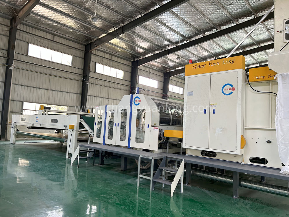 3. CYLMX-1850大仓给棉机:将开松纤维进一步松混合,并处理成均匀的筵棉供下道工序。容积式定量喂入,光电控制、调节方便、给棉量准确均匀。