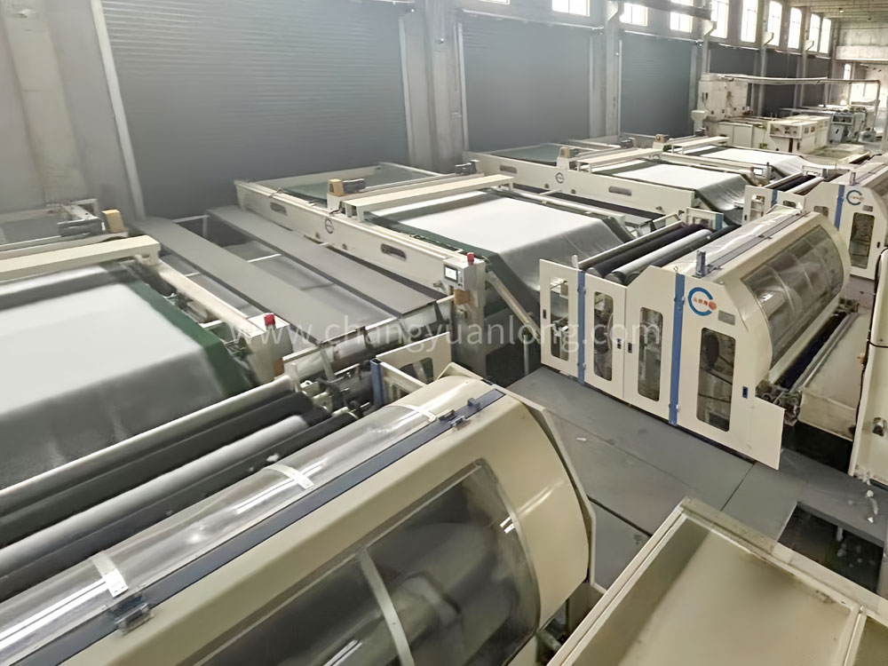 5. CYLPW-2200铺网机:机架采用6mm钢板折弯而成,铺网帘之间加补偿电机,减少纤网牵伸。往复换向用变频控制,冲击力小,能自动缓冲平衡换向,并配有多段速控制。底帘可调节升降,使棉网能按照所需要的单位克重均匀铺叠到底帘上,供下一道工序使用。斜帘﹑平帘和大车平帘用高档优质皮帘,底帘和环帘为木帘子。