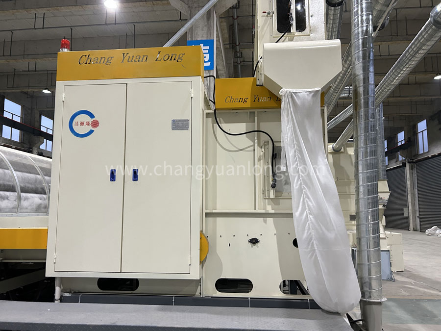 (2)纤维经排气箱进入储棉箱,光电开关控制储棉量,由角钉帘(内衬布帘)带入输棉道。