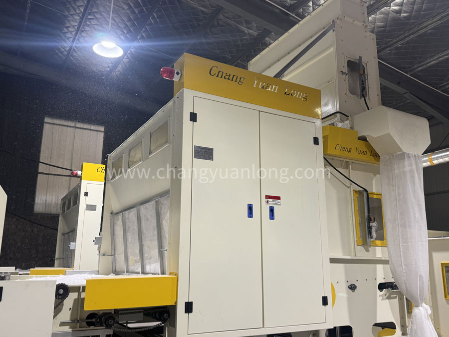 给棉机:仿台式给棉机结构,旋风器加尘笼落棉,两道光电控制:一道根据储棉仓的储棉量控制开松机,另一道根据振动仓的棉量控制角钉帘。储棉仓、振动仓的储棉量可调节。通过振动板和光电的控制使给棉机能定量、均匀地把原料输送给梳理机。平帘和斜帘为皮质帘。