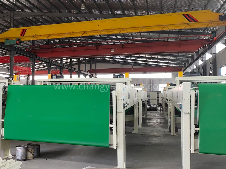(2)铺网机有输入帘、储存帘、落网帘、底帘、往复传动机构,宽幅调节及提升机构等各部分组成,往复采用变频控制。底帘为塑料帘,其余为木帘。