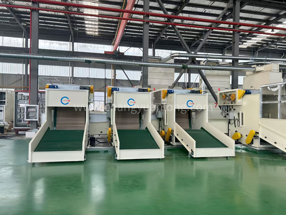 1. CYKB-1200 开包机:开松各种捆包纤维,按比例由电子秤进行称量,均匀平铺在混棉帘上。各种不同纤维被放入水平输送帘,经压棉辊和对辊罗拉喂入,经高速打手开松后由输棉风机送到下道工序。
